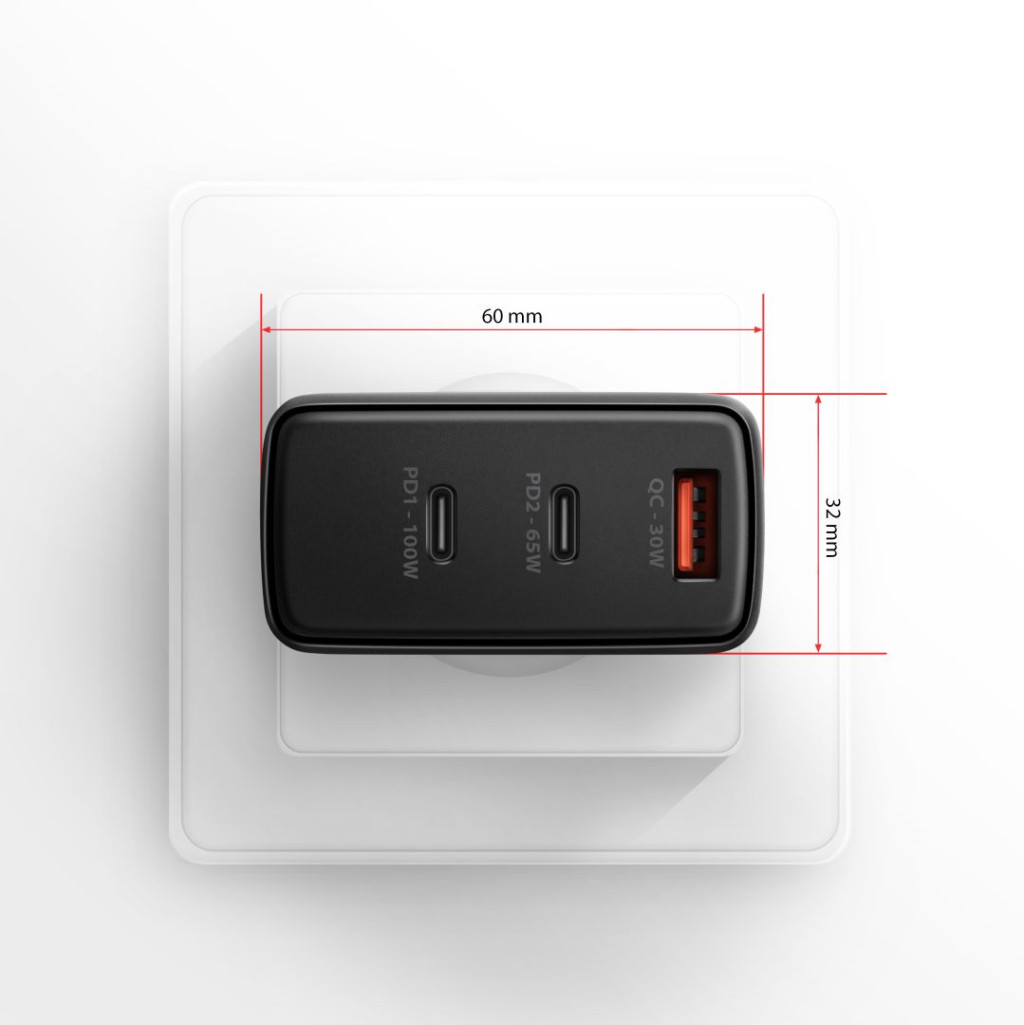 Utazó fali töltő AXAGON ACU-DPQ100 GaN egyszerre akár három mobileszköz gyors töltéséhez. A 100W összteljesítménnyel a töltő a lehető legnagyobb sebességgel tölti a notebookokat, telefonokat és más mobileszközöket. Az adapter egy szabványos USB-A csatlakozóval, de két kétoldalas USB-C csatlakozóval is rendelkezik.