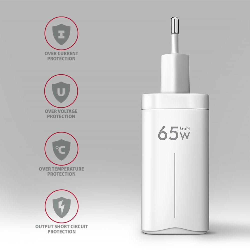 Kompakt utazó fali töltő AXAGON ACU-DPQ65W GaN egyszerre akár három mobileszköz gyors töltéséhez.