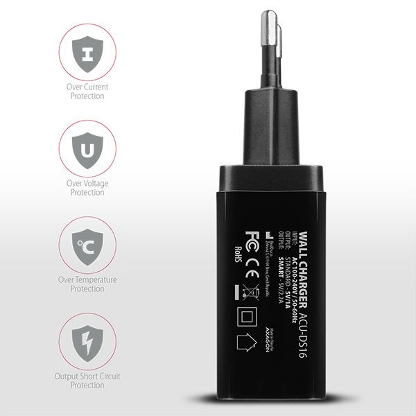 AXAGON ACU-DS16 hálózati duális USB töltő egyidejűleg akár két hordozható eszköz töltésére.