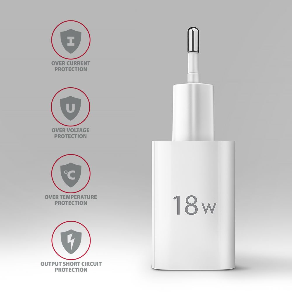 Az AXAGON ACU-QC18W USB hálózati töltő mobil eszközök töltésére szolgál. A 18W összteljesítménnyel a töltő a lehető legnagyobb sebességgel tölti a telefonokat, táblagépeket és más mobileszközöket. Az adapter szabványos USB-A csatlakozóval rendelkezik.