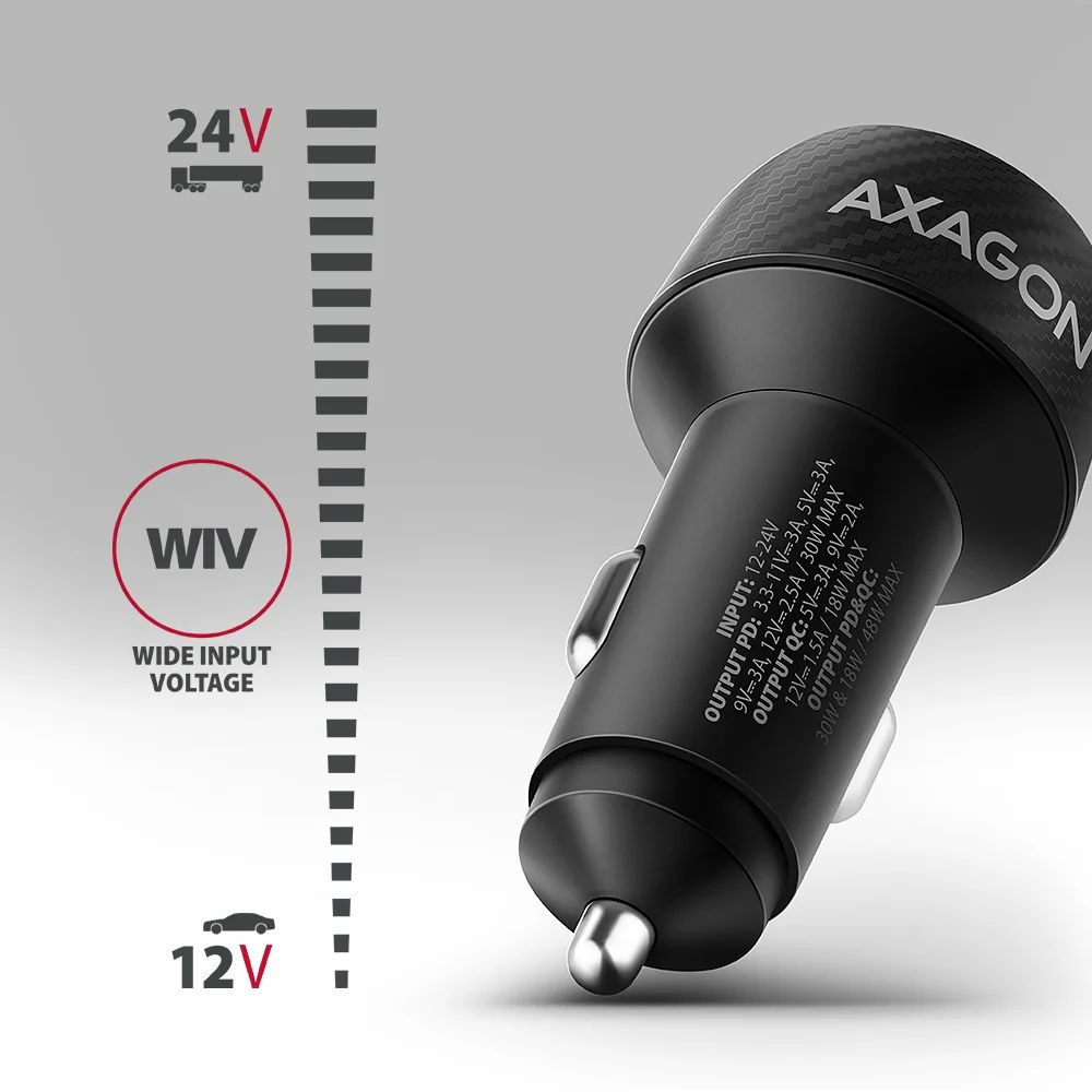 Az AXAGON PWC-PQ48 univerzális autós töltő lehetővé teszi akár két mobil eszköz gyors és kényelmes töltését útközben. A 48 W teljes teljesítménynek köszönhetően a töltő a lehető legnagyobb sebességgel tudja tölteni a telefonokat és táblagépeket. Az adapter nemcsak szabványos USB-A csatlakozóval, hanem fordítható USB-C csatlakozóval is rendelkezik.