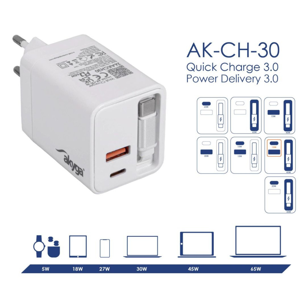 Az Akyga® AK-CH-30 azok számára készült, akik nem hajlandók kompromisszumot kötni. Szeretné egyszerre tölteni a laptopját, telefonját és fülhallgatóját, anélkül, hogy kompatibilitási problémákkal kellene foglalkoznia? Ez a töltő mindent megtesz – csak csatlakoztassa, és élvezze a modern töltési technológia teljes erejét.