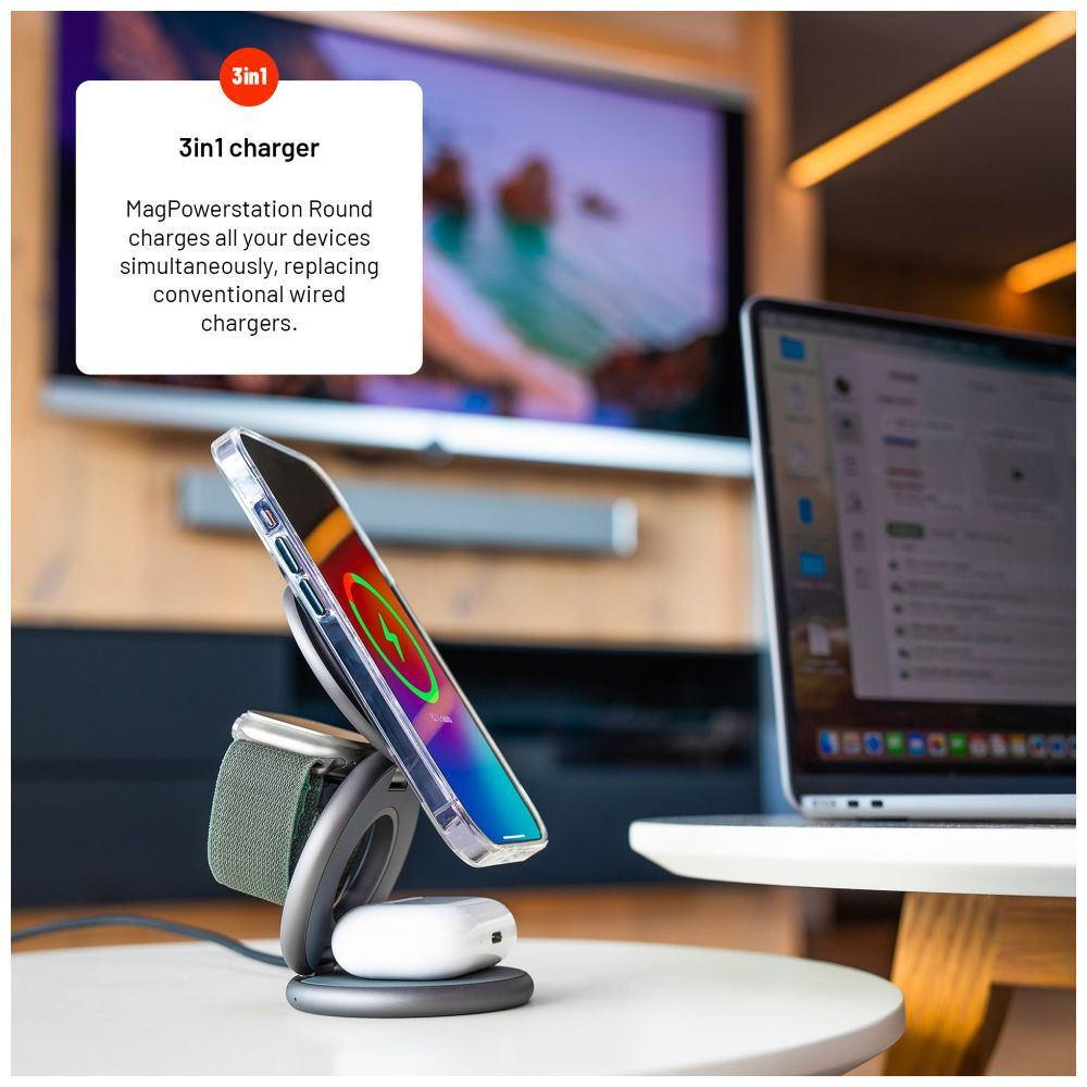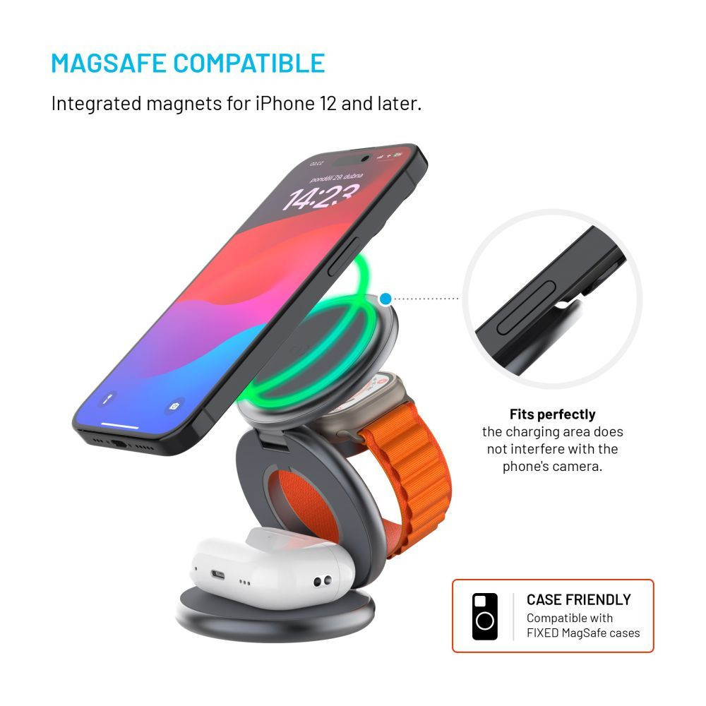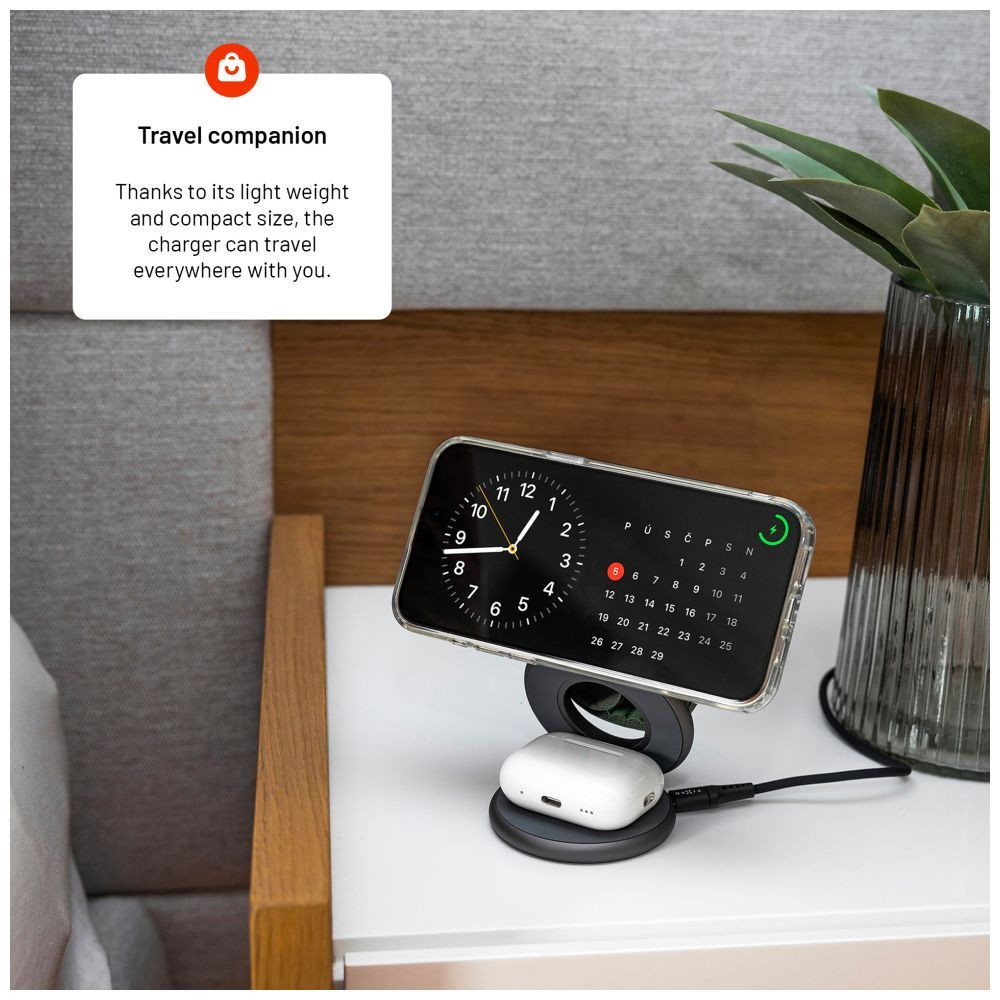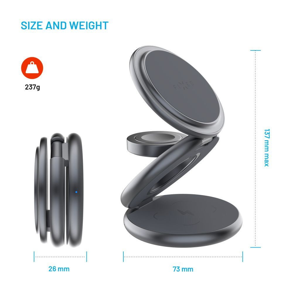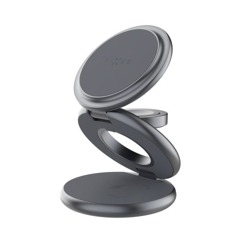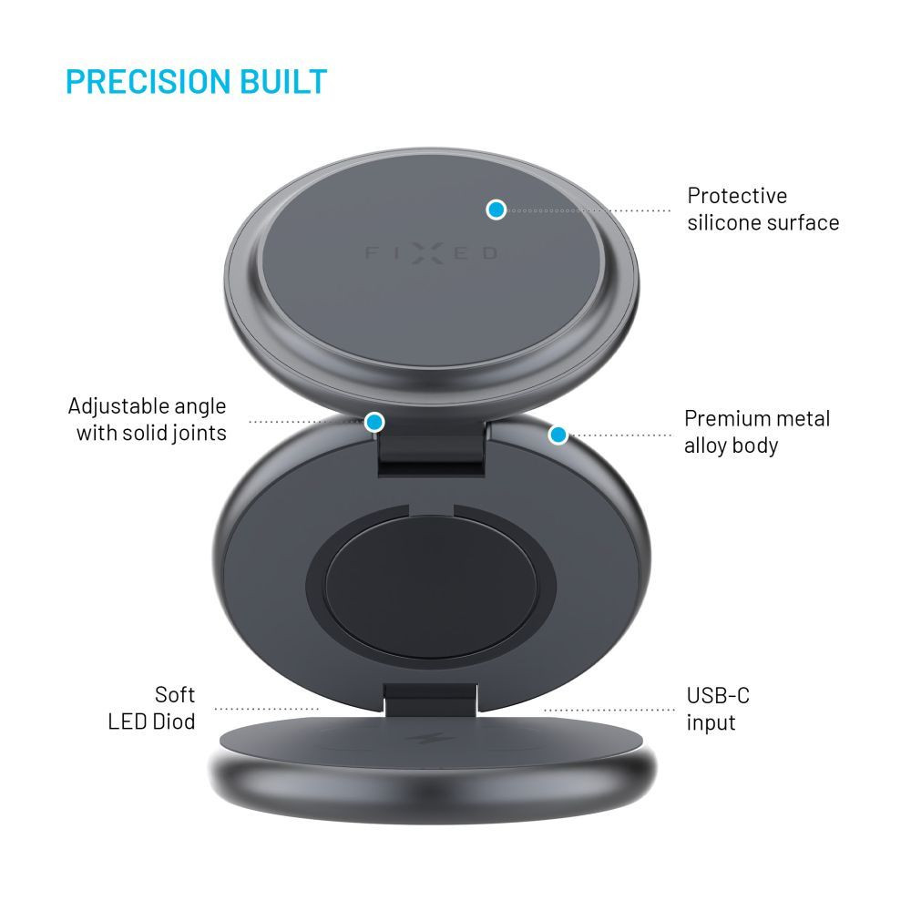 A kompakt, MagSafe-képes FIXED MagPowerstation Round vezeték nélküli töltő ideális választás akár három eszköz egyidejű töltéséhez. A MagSafe mágnesekkel ellátott fő töltőfelület szilárdan megragadja a 12-es sorozatú iPhone-t és a felette lévő készülékeket, akár függőleges, akár vízszintes helyzetben vannak, és azonnal megkezdi a vezeték nélküli töltést 7,5 W-os teljesítménnyel. Emellett a megemelt felületet pontosan úgy alakították ki, hogy ne zavarja a telefon kameráját, így biztosítva a biztonságos rögzítést és töltést. Más márkájú telefonokat akár 15 W-os teljesítménnyel is tölthet. Egy második felület a vezeték nélküli fejhallgatók töltésére szolgál, és egy integrált felhajtható felületet az Apple Watch-hoz terveztek. A töltő teste tartós fémötvözetből készült, szilikon elemekkel, amelyek megvédik a töltött készülékeket a karcolásoktól. Az állítható csuklóknak köszönhetően az állvány ideális szöge beállítható, hogy szilárdan tartsa a kiválasztott pozícióban. Összecsukott állapotban a kompakt méret ideális az utazáshoz, a felső felületet pedig továbbra is használhatod töltőpadként. A töltő USB-C bemeneti csatlakozóval rendelkezik, és a teljes teljesítményhez legalább 25 W-os PD szabványos tápegységre van szüksége.