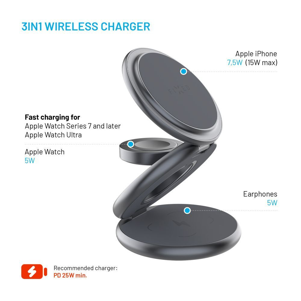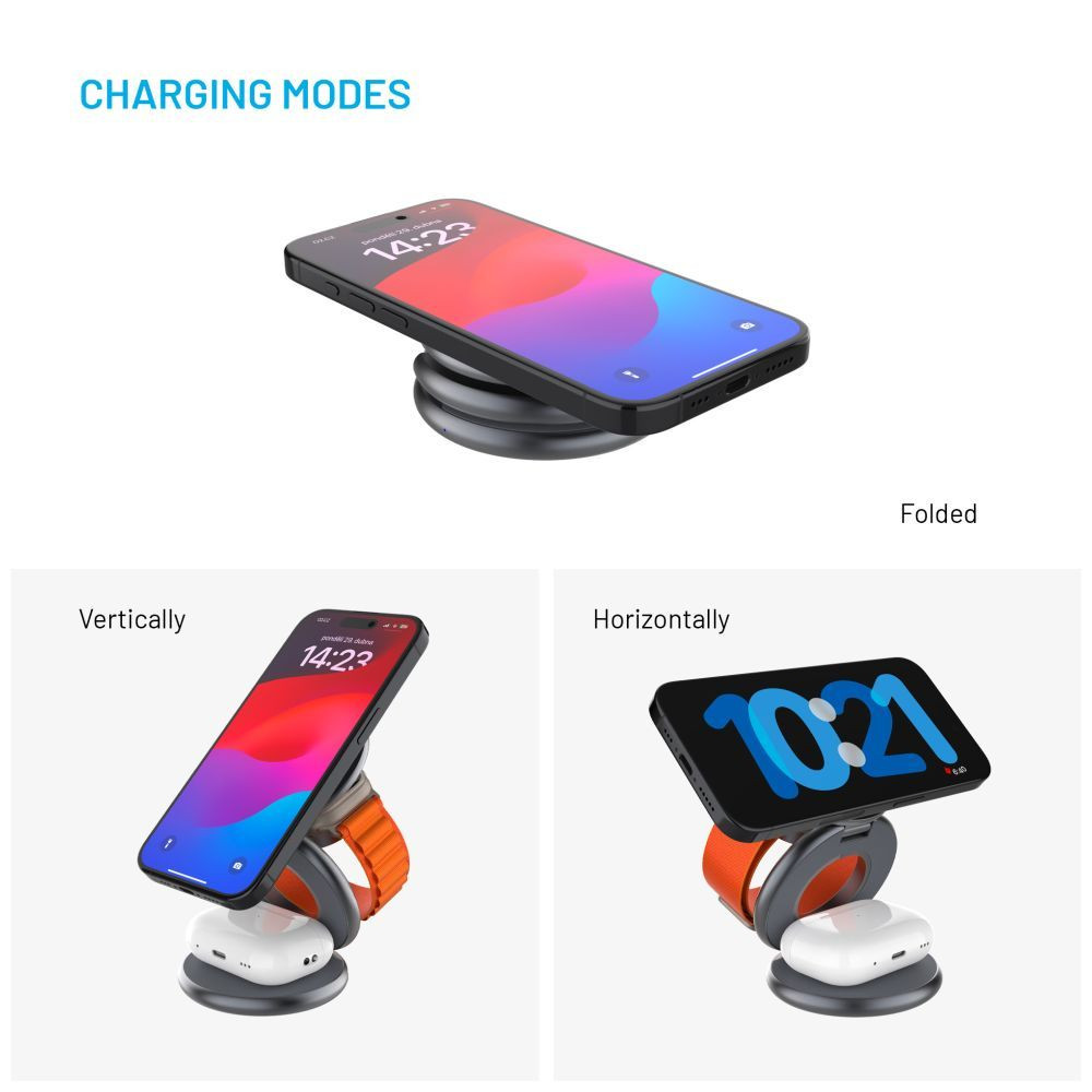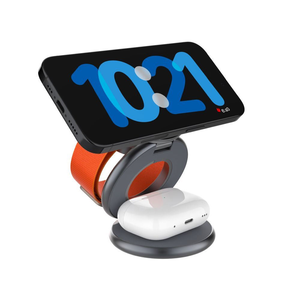 - MagSafe kompatibilis 3 az 1-ben vezeték nélküli összecsukható töltő.- Fő MagSafe töltőfelület az iPhone 12-es sorozatú vagy annál magasabb iPhone készülékekhez- vezeték nélküli fejhallgató töltőfelület- Integrált Apple Watch felhajtható töltő gyors töltéstámogatással az Apple Watch 7., 8. és 9. generációjához és az Apple Watch Ultra 1. és 2. generációjához.- Fixen állítható ízületek az ideális állványszögért- Tartós fémötvözetből készült, elegáns színű test- Szilikonfelületek a készülék karcolásoktól való védelme érdekében- A megemelt fő töltőfelület követi a telefont, és nem zavarja a kamera területét- Kompatibilis a MagSafe borítókkal és tokokkal- Kompakt, összecsukható kialakítás- Töltési állapotjelző LED- USB-C tápcsatlakozó (minimum 25 W-os PD-adapter ajánlott)