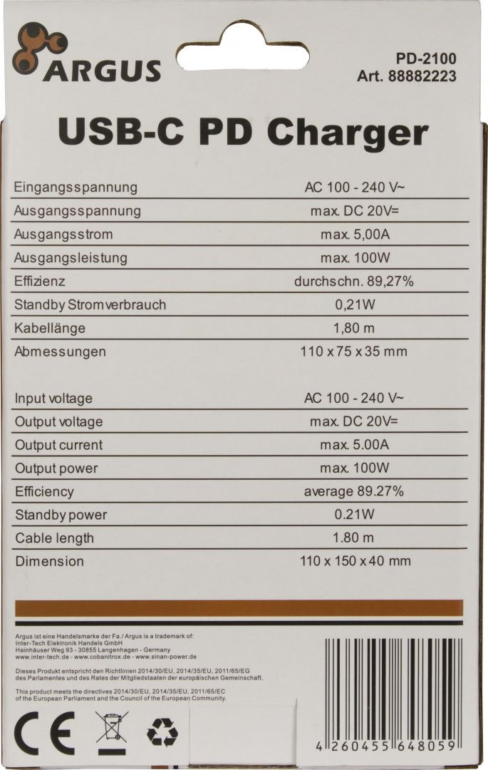 Inter-Tech Argus PD-2100 USB-C 100W PD Charger Black