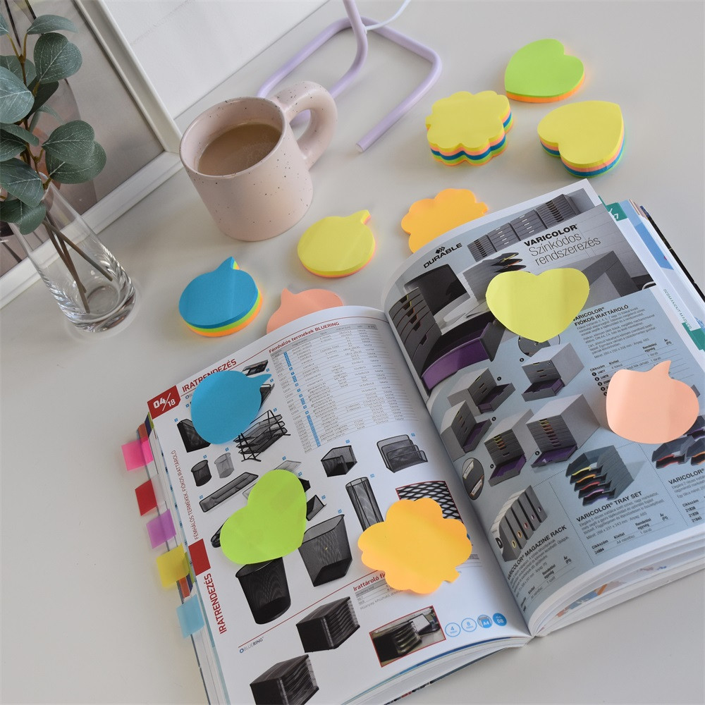 Ideális rövid üzenetekhez, jegyzetekhez. Szinte minden felületen tapad és könnyen visszaszedhető. Feltűnő élénk színű,és formájú, hogy ne vesszen el az információ. Katalóguskód: 24195