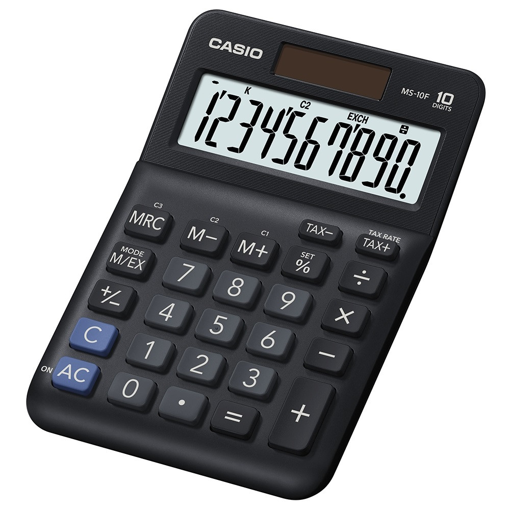 10 számjegyű, NAGY DÖNTÖTT KIJELZŐ, ÁFA számítás, valutaátváltás, elem+napelem, %, +/- Katalóguskód: 57612
