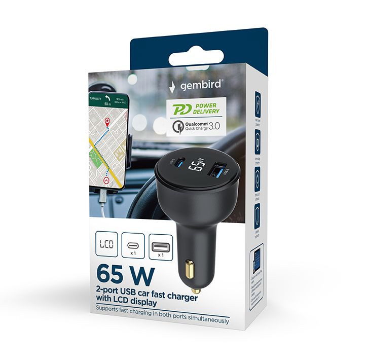 Gembird 2-Port USB Car Fast Charger Type-C PD LCD 65W Black