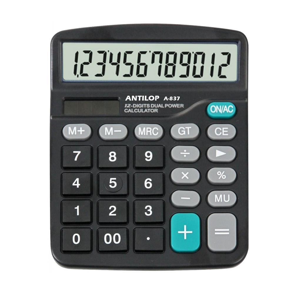 Antilop A837 fekete asztali számológép 12 számjegyű nagy kijelző, memória funkció, százalékszámítás, gyökvonás, előjel váltás, GT funkció, vissza léptetés és alapműveletek. Működési mód: ceruzaelem+napelem. Méret: 145 x 120 x 40 mm. Katalóguskód: 1736