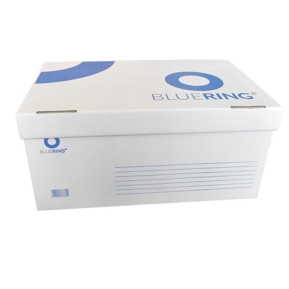 Archiváló konténer karton doboz fedeles 54x36x25cm, felfelé nyíló tetővel Bluering® fehér-kék